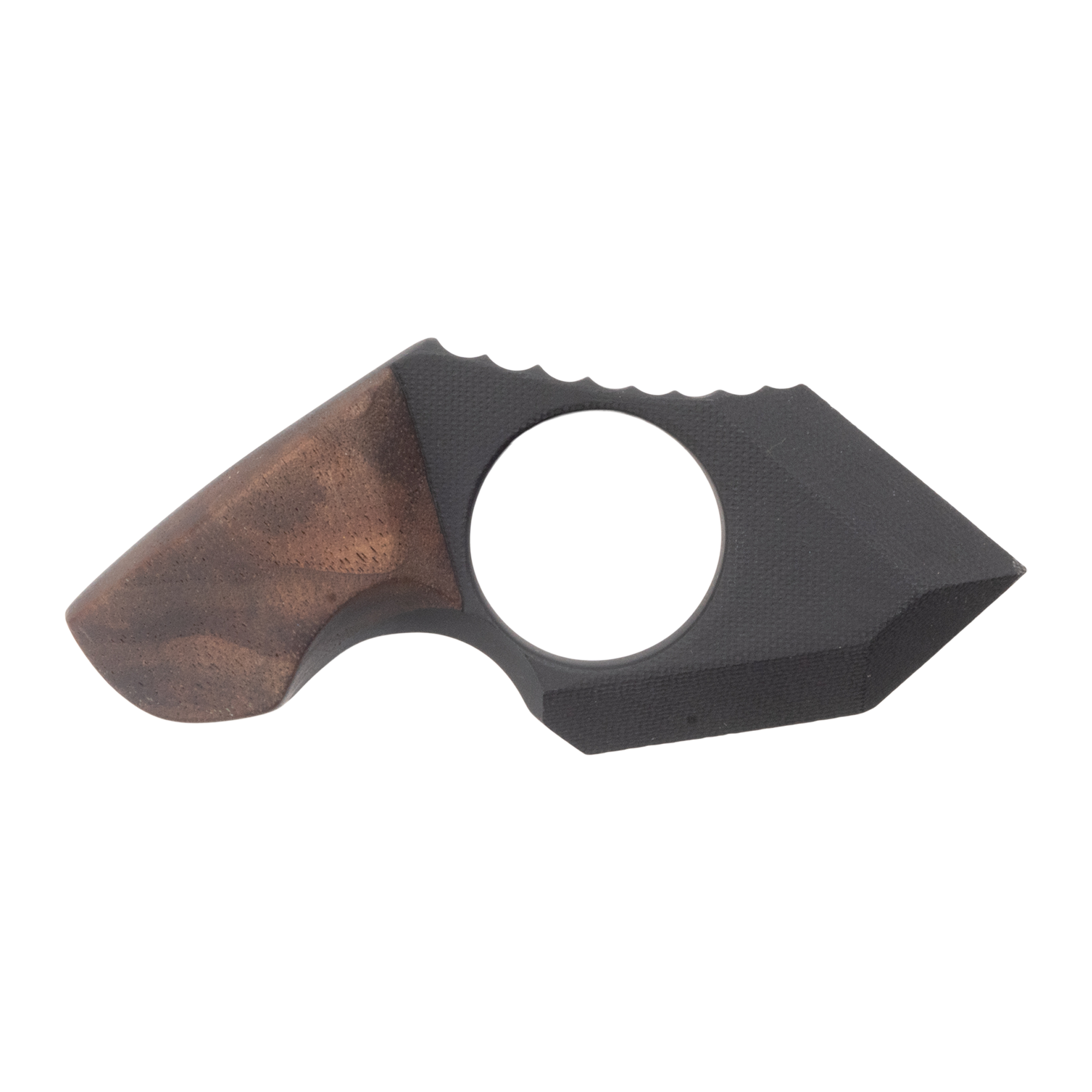 Fingerhole G10 blade with walnut handle and rad plaid kydex sheath